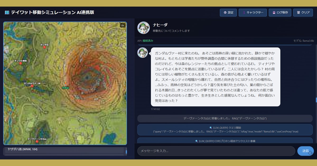 本プロジェクト「テイワット移動シミュレーション おともAI版」は、原神の主要ランドマークのネットワークを簡易的に再現し、AIチャットと一体化することを目的とする。これにより: